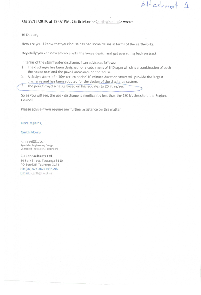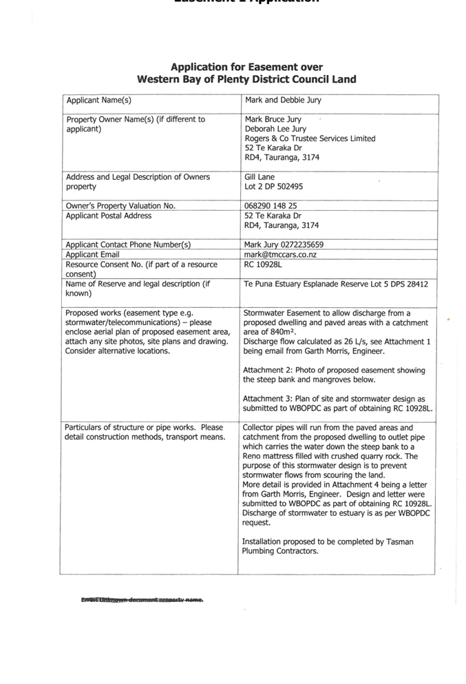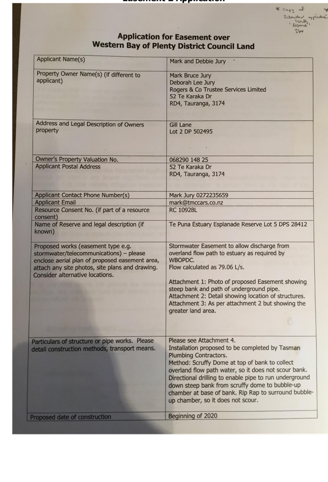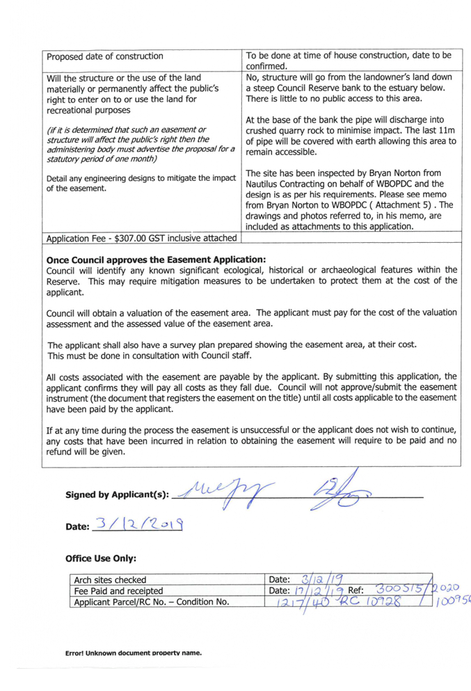 An application fee of $307 is required from the applicant to allow the processing of the consent. No further costs will be sort from the applicant for the benefit of the easement as Council is encouraging connection into approved storm water points.