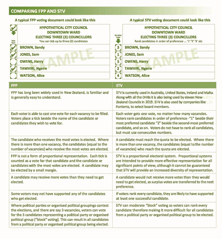 A table comparing FPP and STV (as used in a territorial authority’s electoral system poll and approved by DIA) follows: