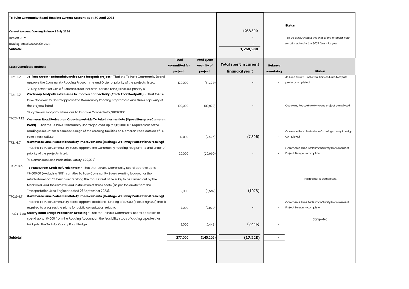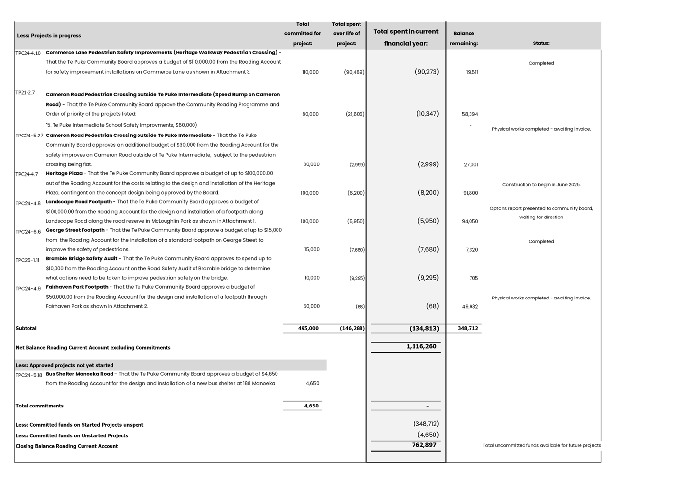 The Te Puke Community Board Roading Current Account has now been incorporated into the financial report. The opening balance of $1,268,300, has been reduced by spending on projects and now has a balance of $1,116,260 as at 30 April 2025 excluding commitments and has a balance available for future projects of $762,897 after including commitments for current approved projects. Attached is a more detailed report for the period ended 30 April 2025 (Attachment 2).