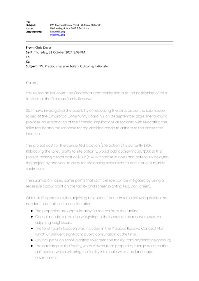 3. b Relocate the toilet facility to a new position on Precious Reserve as shown on Attachment A and increase the budget to relocate the toilet by $50,000 funded from rates in the 2025/26 Financial Year or; |