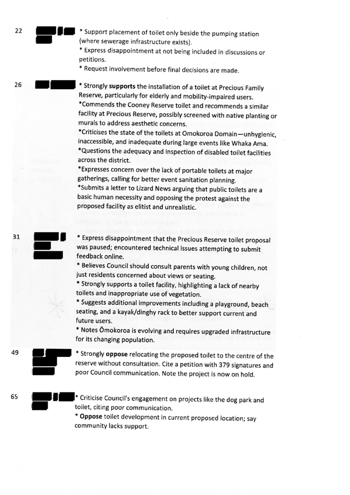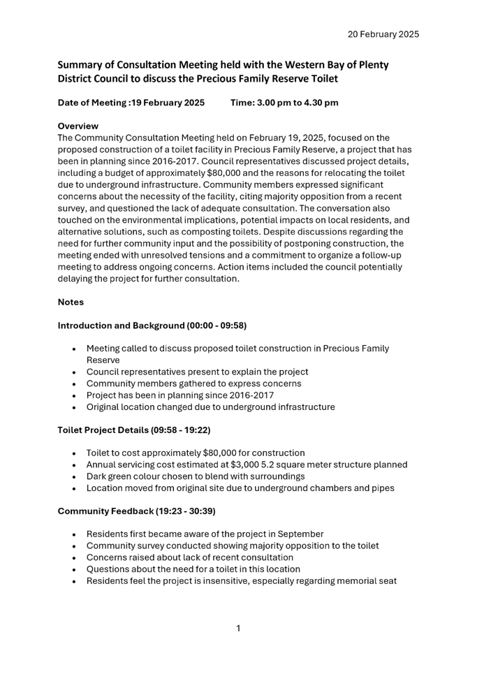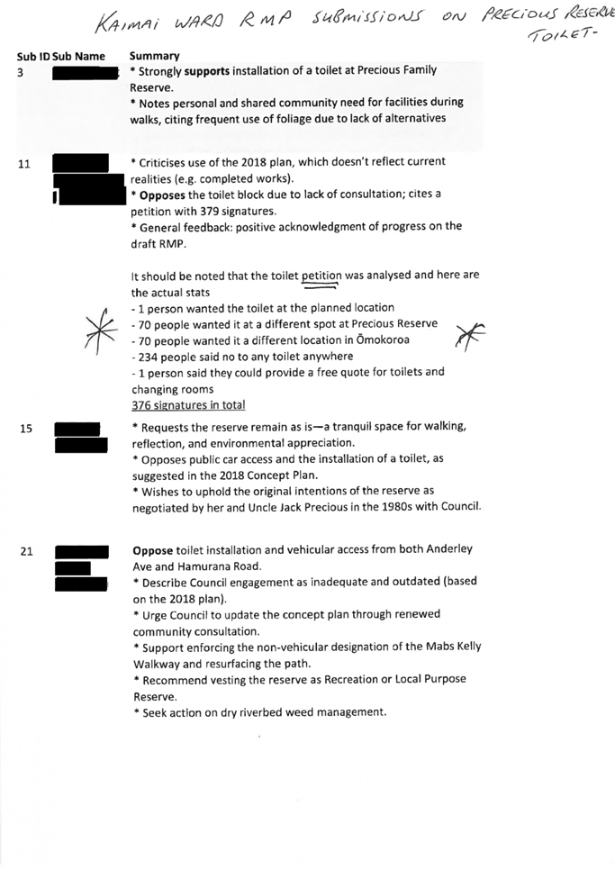 12. Council also received submissions on the Precious Reserve toilet through the Kaimai Ward Reserve Management Plan review. A synopsis of these submissions (both for and against) are included as Attachment 7.