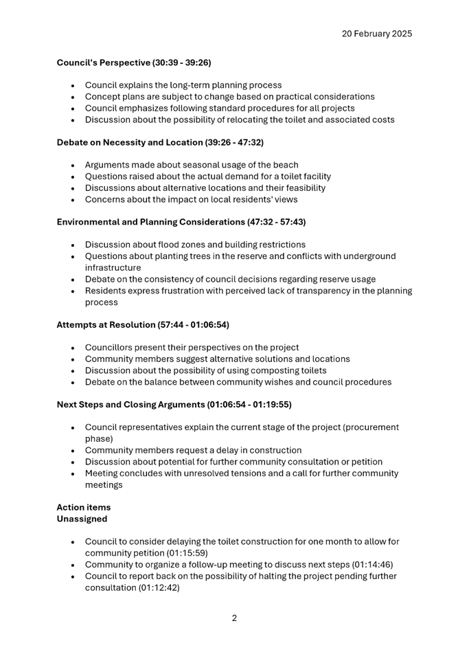 11. There was a public meeting held on site on 19 February where staff and several Ward Councillors attended a site meeting were approximately forty members of the public attended (Attachment 6) are the minutes taken by the meeting organiser. The meeting was recorded. It was agreed that the installation of the toilet facility would be delayed by one month to allow the adjoining residents time to prepare a petition to Council. The petition was considered at the 10 March Committee meeting.