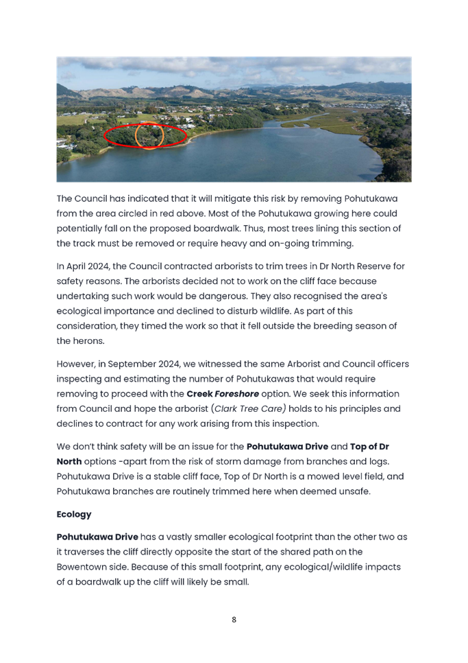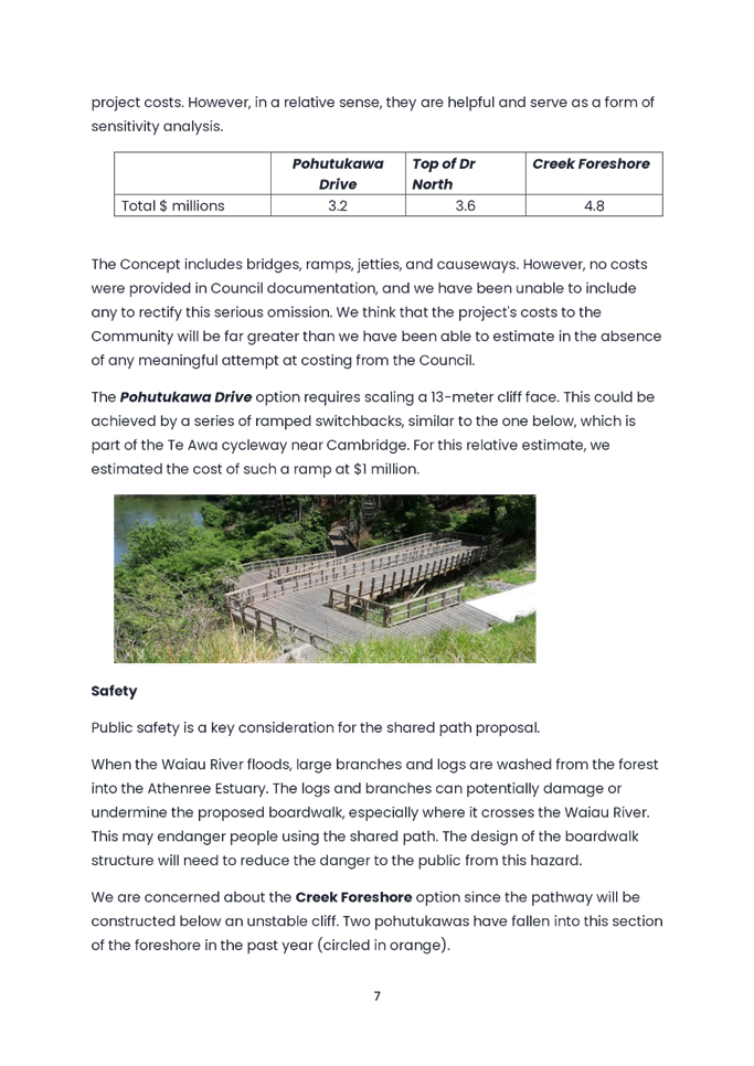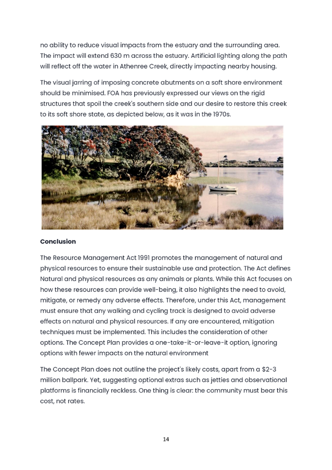 Disadvantages Economic: · potential business growth lost opportunity Social: · contrary to public messaging, expectations and community plans – damage to Council reputation. · Lost opportunity to enhance community connectivity, social interaction, travel times, various recreational activities and a healthier lifestyle. Cultural: · lost opportunity for the preservation and celebration of cultural heritage, cultural narratives and educational opportunities. · Lost of trust with community and key project partners Environmental: · Lost opportunity for increased education, user engagement with the estuarine environment, fostering awareness and appreciation for local biodiversity and environmental stewardship. |