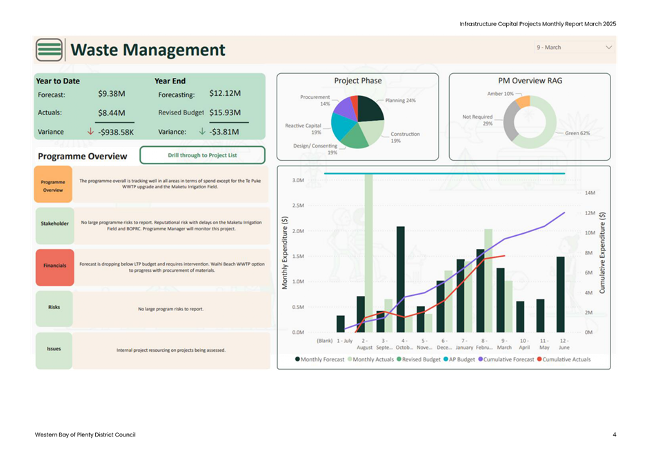 Te Puke Wastewater Treatment Plant (WWTP) This project remains a concern and high risk. A specific PPG has been established to support this project with independent specialists relating to probity and technical. The contract with Councils design consultant has been terminated. Council has procured the services through an Early Contractor Involvement (ECI) process to assist the design and build. Alternative technology has been investigated through ECI contractor that appears to be a viable technical solution with significant cost savings. Council is currently seeking legal advice on converting the ECI contract to a Design and Build contract. A separate report will be presented to Council to discuss this further and seek approval to start physical works. Consent – The earthworks consent has been obtained. This allows earthworks to start once the design is complete. The discharge consent condition deadlines will not be met, and a consent variation has been approved to extend the timeframes for meeting the discharge conditions. Consultation – Targeted consultation will be required for the final design. Iwi –Significant progress has been made with the relationship with iwi and how we can work together to enable a positive outcome for all involved. |