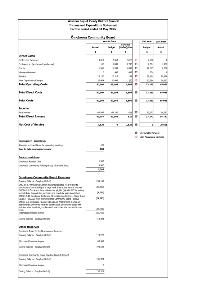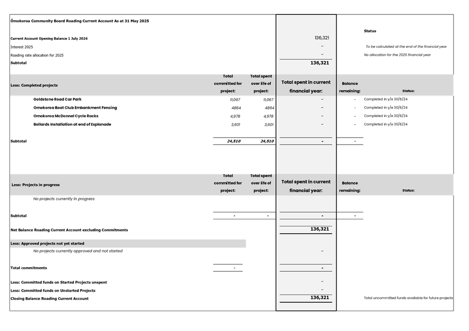 The Ōmokoroa Community Board Roading Current Account has now been incorporated into the financial report. The opening balance of $136,321 has not moved as at May 2025, it is available for future projects with no pending commitments or current approved projects. Attached is the report for the period ended 31 May 2025 (Attachment 2).