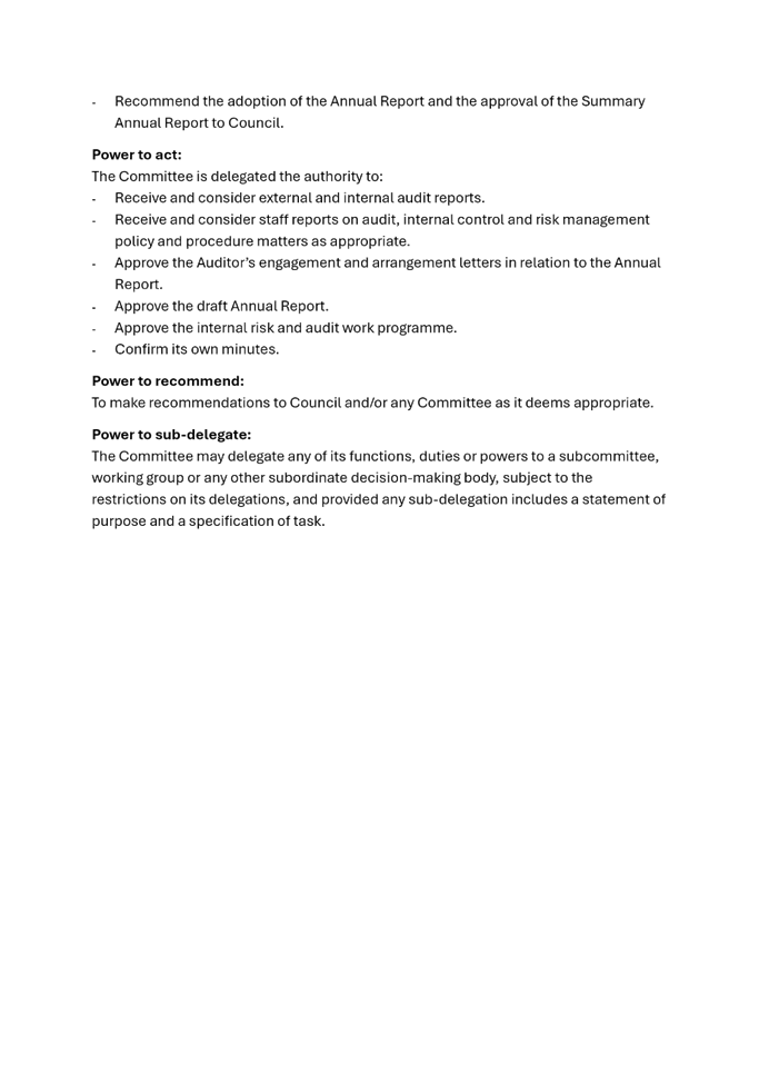 · The power to adopt a Long Term Plan, a Long Term Plan Amendment, Annual Plan or Annual Report and to receive any related audit report;