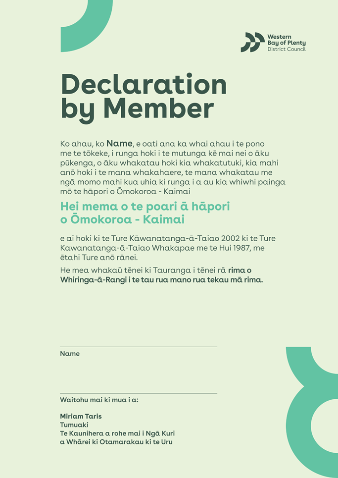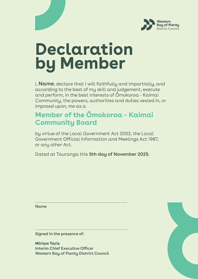The Making and Attesting of the Declaration of Ōmokoroa-Kaimai Community Board Members (witnessed by the Chief Executive Officer).